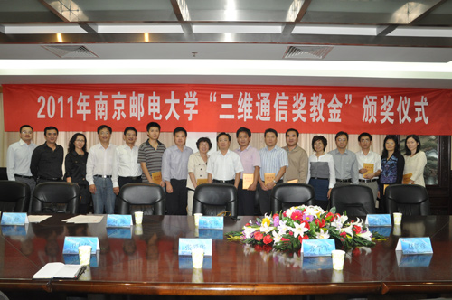 9月29日下午,在三牌楼校区科学报告会堂第三会议室,我校举行了“2011年南京邮电大学‘三维通信奖教金’颁奖仪式”。人事处陈春玲副处长宣读了《关于表彰2011年南京邮电大学“三维通信奖教金”获得者的决定》。2011年共有卢官明等三位教师获一等奖、张爱华等五位教师获二等奖、石小娟等十位教师获三等奖。教育科学与技术学院吴伟敏老师获得三等奖。