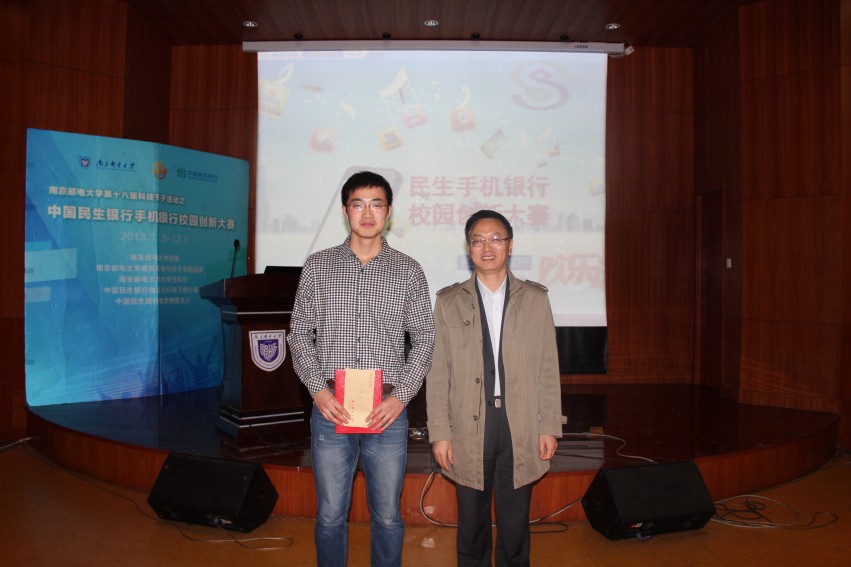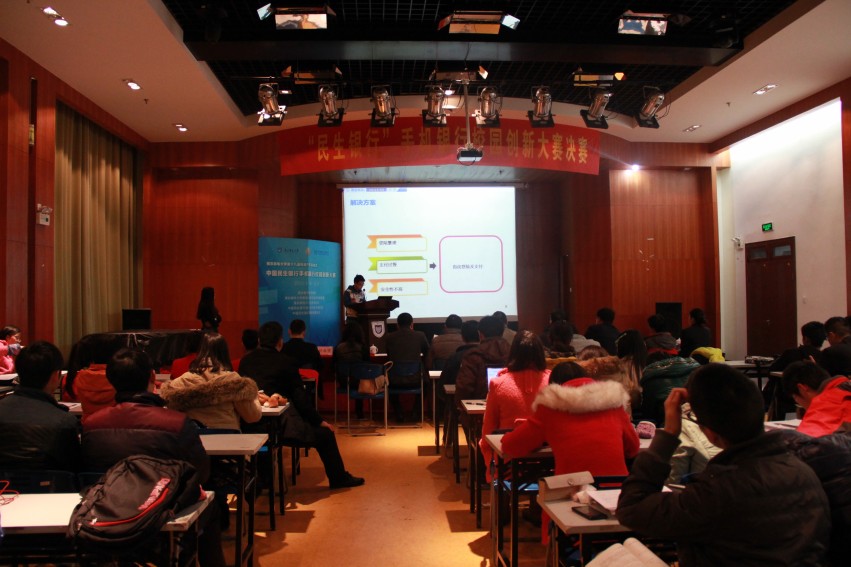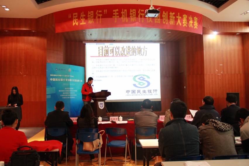 随后,主持人详细介绍了本次决赛的比赛规则,在前期46件各类作品中层层选拔入围的10组创新团队上台展示。各参赛团队紧密围绕民生银行手机银行撰写了个性创意方案,并且就其各自参赛方案进行具体的展示和介绍。“手机银行指纹身份认证系统”、“手机银行即时结算”、“手机银行财务小管家”、“UI优化设计”等一个个新的创意,让评委看到了我校学生的创新潜力,也引来了现场观摩同学的阵阵掌声。经过专家评审打分和综合评议,最终我院刘同、王楚南同学合作的“手机结算”方案脱颖而出,勇夺桂冠;贝尔学院蔡守桂“指纹身份验证系统”等3组作品获大赛二等奖;人文与社会科学学院张耀东“移动客户端的创意与开发”等6组作品获大赛三等奖。