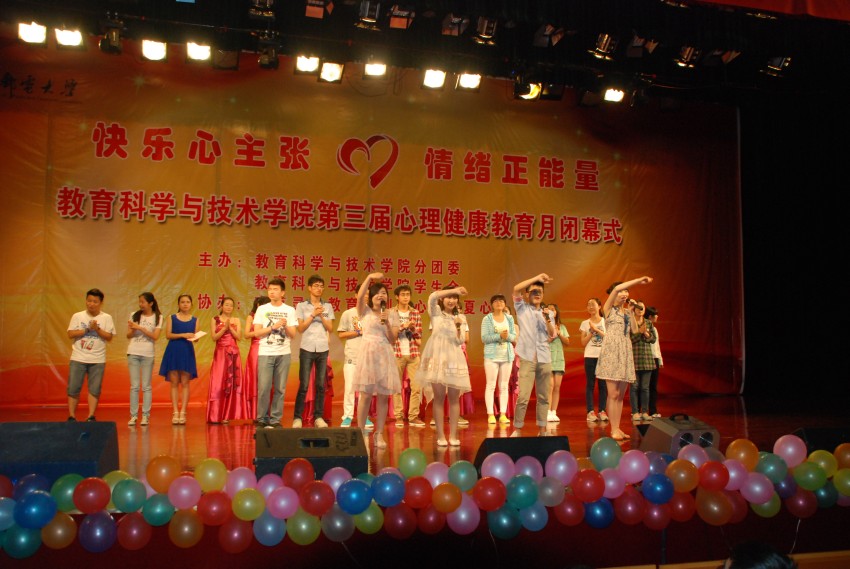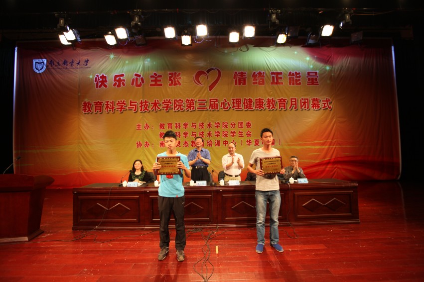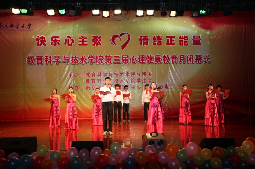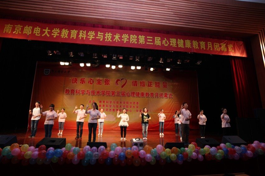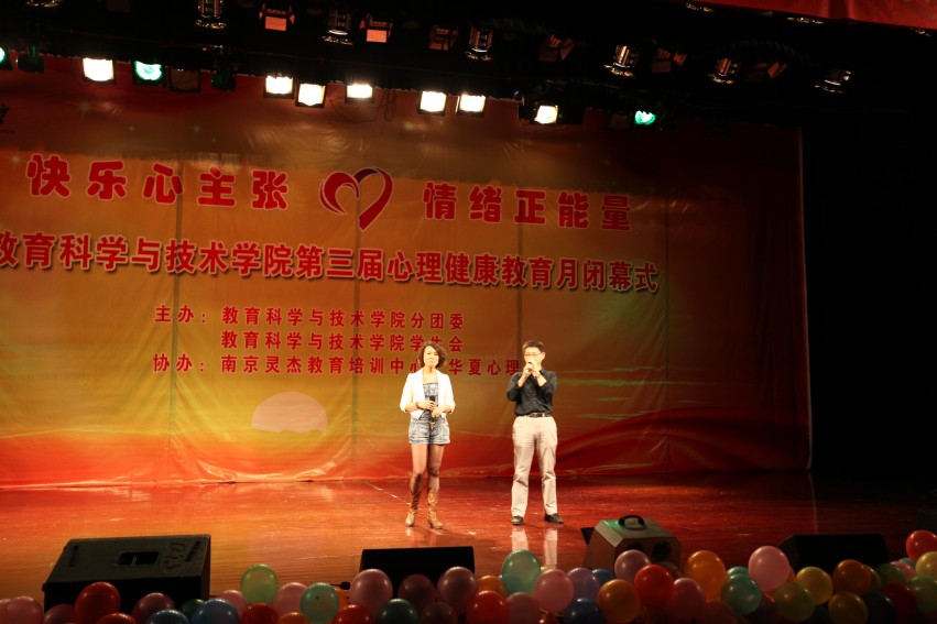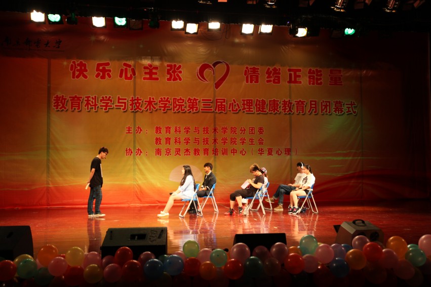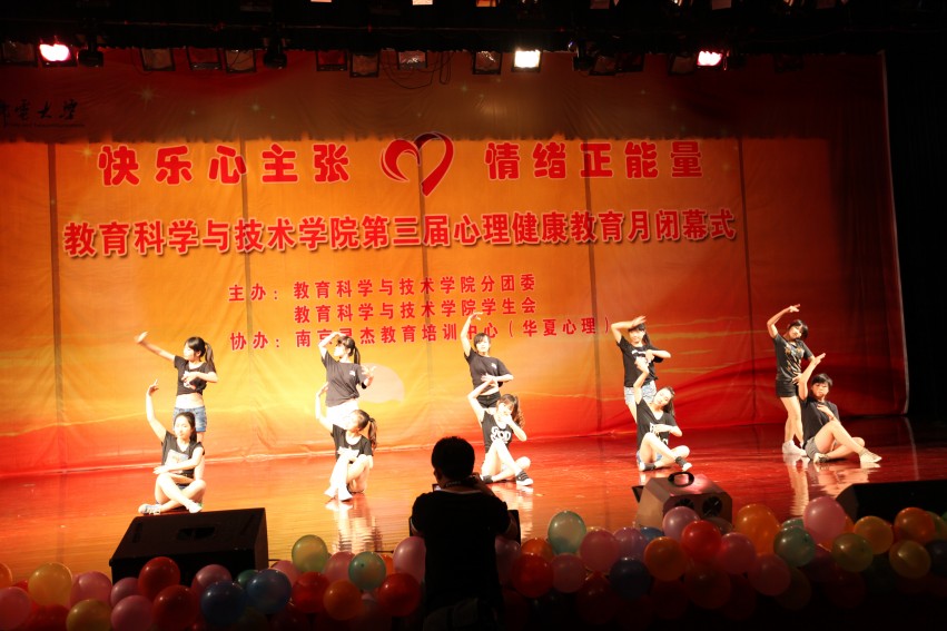 总结表彰大会后,精彩的文艺汇演将整场活动推向了高潮。心理健康教育月视频集锦让大家重温了活动中的点点滴滴;858社团带来爵士舞表演热情奔放;唐湘宁、刘永贵两位老师用动情的歌喉奉上一曲《在水中央》;院心协成员的诗朗诵《给心灵放个假》,深情舒缓的语调让人内心平和;南京财经大学心协的手语剧《后青春期的诗》和南京信息职业技术学院心协的心理情景剧《我的大学AB面》,一个发人深思,一个活泼欢快,不同的表演形式,同样的心灵震撼。现场气氛高潮迭起,掌声不断。