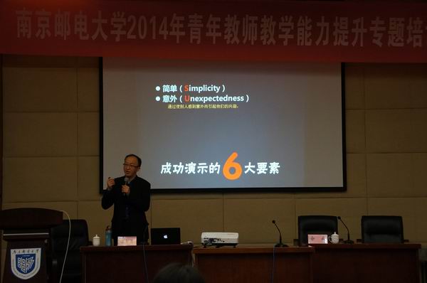 10月29日下午,由教务处(教师教学发展中心)主办、我院承办的2014年青年教师教学能力提升专题培训暨教学沙龙活动在仙林校区行政楼一楼报告厅进行,我院霍智勇教授进行了“PPT设计与媒体教学”的讲座。我院教师及2014年学校新进教师参加了本次活动。活动由我院副院长余武教授主持。