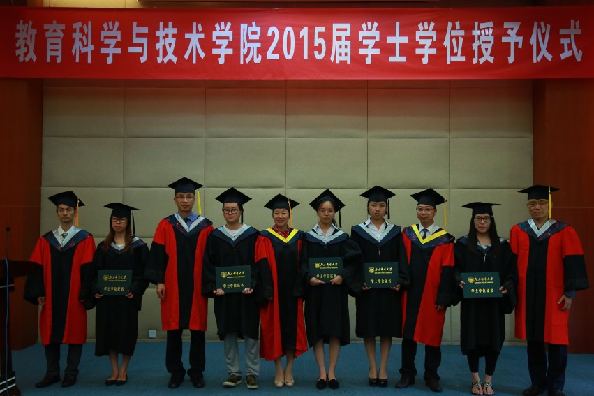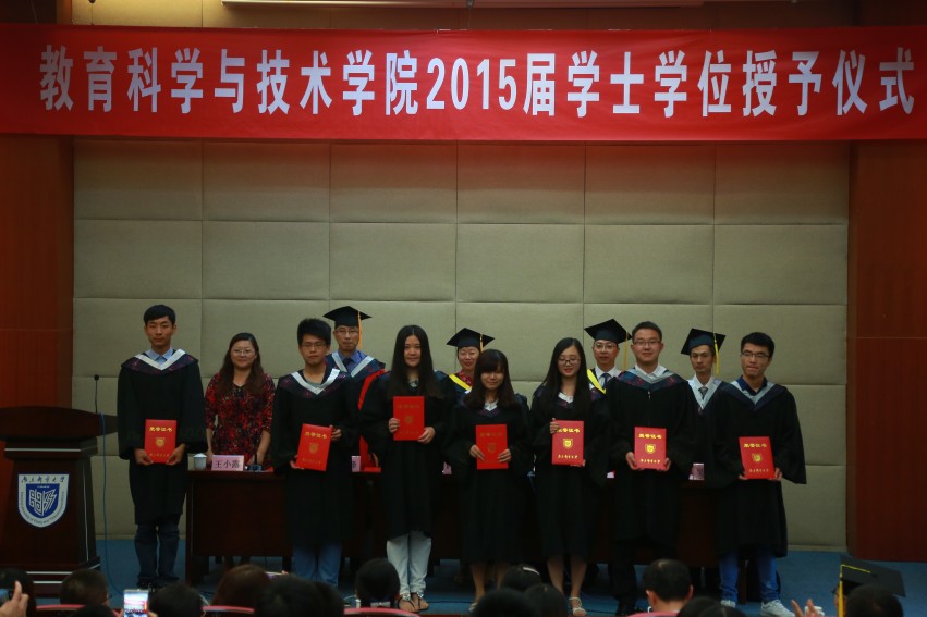 卢峰副院长宣读了授予教育技术学专业41名毕业生理学学士学位、数字媒体技术专业50名毕业生工学学士学位的决定。伴着欢快的音乐声,全体毕业生身着学士服、头戴学士帽,穿戴整齐,依次有序走上主席台。叶美兰副校长与学院领导及教师代表余武教授一起为毕业生拨流苏、颁发学士学位证书。