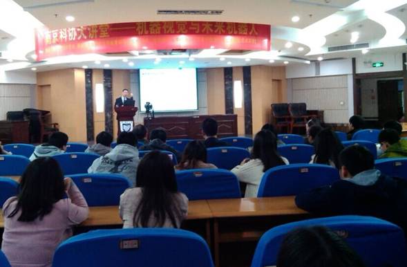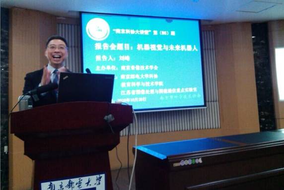 10月28日下午,我院刘峰教授应邀在南京邮电大学三牌楼校区科技会堂一楼报告厅为“南京科协大讲堂”第九十六期活动作了题为“机器视觉与未来机器人”的学术报告会。本次活动由南京音像技术学会主办,南京邮电大学科协、教育科学与技术学院、江苏省图像处理与图像通信重点实验室联合承办。报告会由南京音像技术学会秘书长陆雪萍主持,南京音像技术学会理事长、南京航空航天大学吴庆宪教授,河海大学王建华副教授,南京熊猫电子制造有限公司张槛龙高工,南京邮电大学卢官明教授等校企专家,以及相关专业的研究生和本科生参加了报告会。