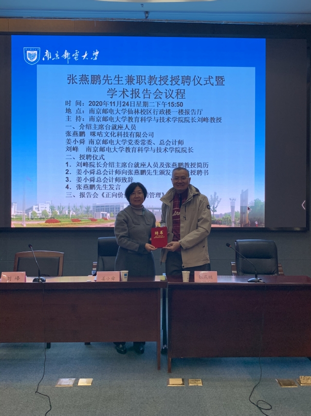 2020年11月24日下午,张燕鹏先生兼职教授受聘仪式暨“科学与人文大讲堂”学术报告会在仙林校区行政楼一楼报告厅举行。我校党委常委、总会计师姜小舜,咪咕文化科技有限公司张燕鹏,教育科学与技术学院副院长刘永贵、张刚要及教育科学与技术学院师生代表参加。会议由教育科学与技术学院院长刘峰主持。
