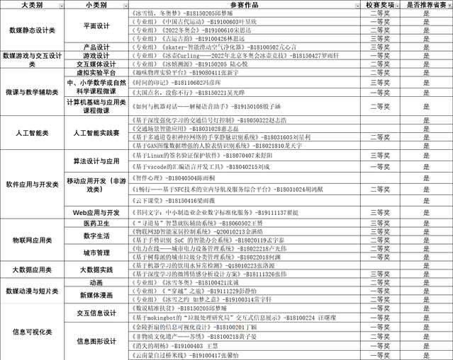 2021年大赛作品分设软件应用与开发、微课与教学辅助、物联网应用、大数据应用、人工智能应用、信息可视化设计、数媒静态设计、数媒静态设计专业组、数媒动漫与短片、数媒动漫与短片专业组、数媒游戏与交互设计、数媒游戏与交互设计专业组等12个大类。共收到了来自近10个院的100多件作品,经过工作人员的筛选,共有89件作品进入校赛。