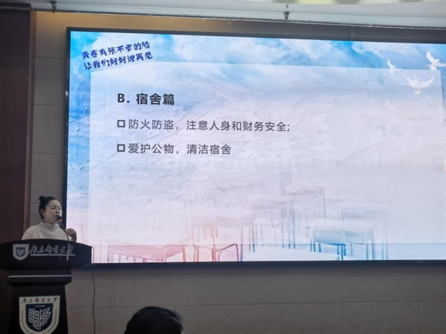 会议内容主要分为三部分。首先,吴美萱老师向同学们介绍了毕业离校的日程安排,演示了毕业离校系统手续办理流程,示范了正确的毕业离校手续办理完成情况;其次,她提出了三点注意事项,要求同学们注意及时领取学位证和毕业证等毕业材料,清空宿舍时注意人身和财务安全,毕业聚会时确保个人安全。最后,她对所有毕业生表示了真诚的祝愿,希望同学们常回来看看。同学们签署了毕业生文明离校倡议。