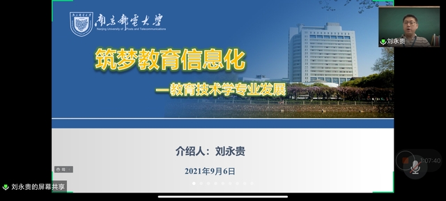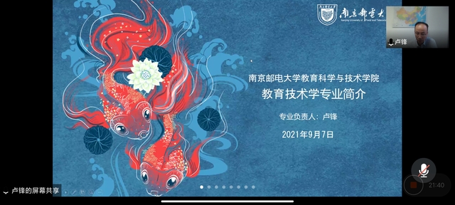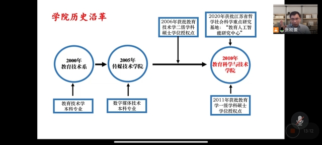 对新生进行专业认知教育,能更快更准确地了解所学专业现状及发展情况,激发新生对本专业的热爱,明确了未来的职业发展方向。2021年9月7日上午,我院教育技术学专业认知教育交流会在腾讯会议平台线上召开。会议由我院教学副院长张刚要主持,专业负责人卢锋教授、刘永贵副院长出席会议,会议特别邀请2001级校友陈娟娟及2000级校友韩冰出席,2021级教育技术学专业全体本科生参与。