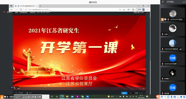 为建立健全全员、全过程、全方位的研究生立德树人体制机制,推进研究生党史学习教育,提高研究生政治认同、家国情怀和文化素养,2021年9月28日,江苏省学位委员会、江苏省教育厅联合主办研究生“开学第一课”活动。南京k1体育组织全体研究生通过网络客户端线上参加、收看此次活动。
