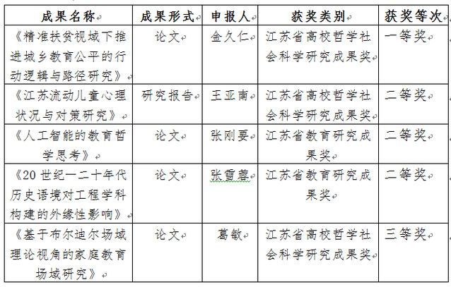 近日,据江苏省教育厅《省教育厅关于公布2021年江苏省高等学校科学研究成果奖获奖成果名单的通知》(苏教科函﹝2021﹞6号)文件以及江苏省教育研究成果奖评审结果,我院导师5项成果获2021年江苏省教育科学研究成果奖,获奖级别和总数均创历史最好成绩,金久仁博士的获奖论文是全省唯一获一等奖的教育学论文。具体获奖成果情况如下: