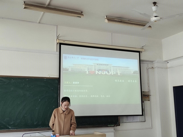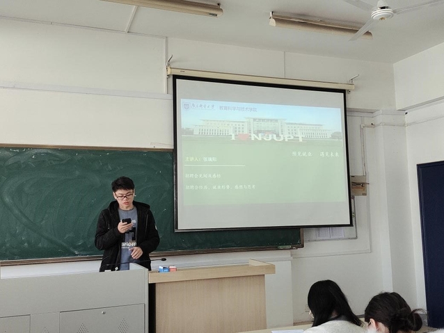 首先由蔡媛梦分享自己刚刚过去的求职经历。蔡学姐目前就职于南京邮电大学后勤管理处饮食服务中心,她结合上半年自己的求职经历,分享了教育学专业的就业方向、就业形势和相关岗位备考的经验等。她特别提醒大家,要早做准备,在校期间要努力积累自己的知识和技能,只有自己的积淀丰富了,求职才能更加顺利。2020级的张瑞阳同学从自己参加的几场大型招聘会出发,为同学们分享了自己的生涯规划感悟,他强调了专业技能在求职过程中的重要性,鼓励大家在有限的时间内多学习多探索,夯实专业基础,拓展相关技能。随后,两位主讲人就现场同学们提出的感兴趣的问题做了回答。