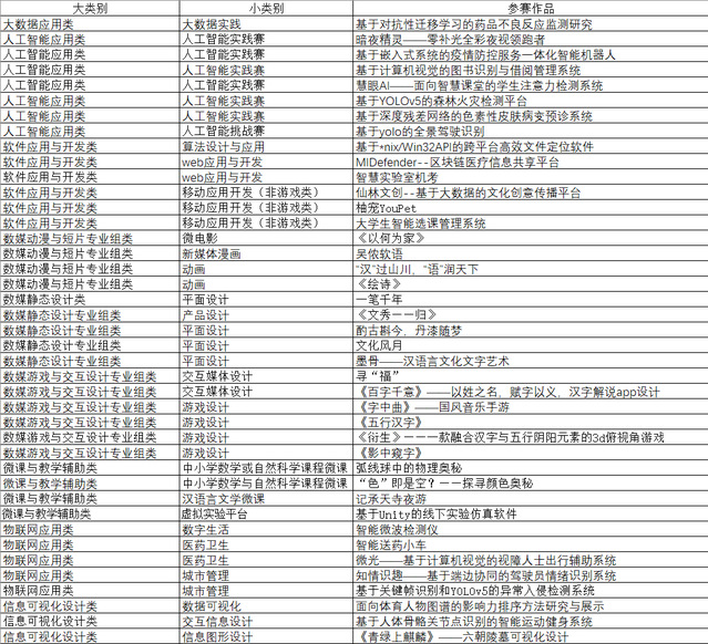2022年大赛分设软件应用与开发、微课与教学辅助、物联网应用、大数据应用、人工智能应用、信息可视化设计、数媒静态设计(普通组)、数媒静态设计专业组、数媒动漫与短片(普通组)、数媒动漫与短片专业组、数媒游戏与交互设计(普通组)、数媒游戏与交互设计专业组、计算机音乐创作(普通组)、计算机音乐创作专业组、国际生“学汉语,写汉字”赛项共15类。