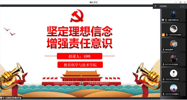 为切实加强入党积极分子的培训教育,提高学员的重任意识, 5月20日,学院党委副书记、院长刘峰为本次入党积极分子培训班学员上《坚定理想信念 增强责任意识》专题党课。根据学校疫情防控要求,本次讲座采用线上形式开展,会议由学院组织员刘颖老师主持。