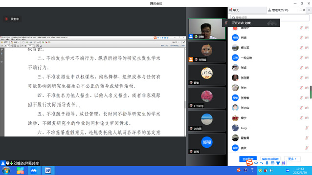 首先,刘峰院长向大家通报了学校疫情防控最新要求,希望各位硕士生导师及所指导学生全力配合学校疫情防控要求,合理有序安排学生的课题研究内容。其次,刘院长带领大家再度学习《江苏省研究生导师职业道德规范“十不准”(试行)》、《研究生导师指导行为准则》等师德师风相关文件,要求全体硕士生导师对师德师风问题要高度重视,期望各位硕士生导师能严守职业道德规范底线。会上,由院党委副书记、副院长张力向硕士生导师通报我院研究生就业情况,学院启动访企拓岗专项活动以来,已经走访相关企业和事业单位,了解用人单位需求,积极推荐学院毕业生。为更好推进学院学生就业工作,张书记希望各位硕士生导师在学业上、在思想都要关心学生,尤其是今年毕业班同学,在全国毕业生就业人数创新高、仍然存在疫情风险的情况下,更要主动做好研究生就业期望工作,确保每位研究生顺利就业。