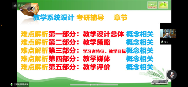 章宁老师针对同学们提出的答疑需求进行总结与分析,又介绍了《教学系统设计》这门课程的考研复习建议与规划,他指出要重点关注报考院校对应的指定教材和历年真题并认真复习三遍,第一遍要理解基本概念原理,第二遍理解概念原理背后的联系、本质、原因,第三遍针对性刷题去提升。随后章老师将教学系统设计课程难点分析划为:教学设计总体、教学策略、教学目标、教学媒体、教学评价五个部分逐步讲解,并深入剖析经典例题,与同学们互动、交流。