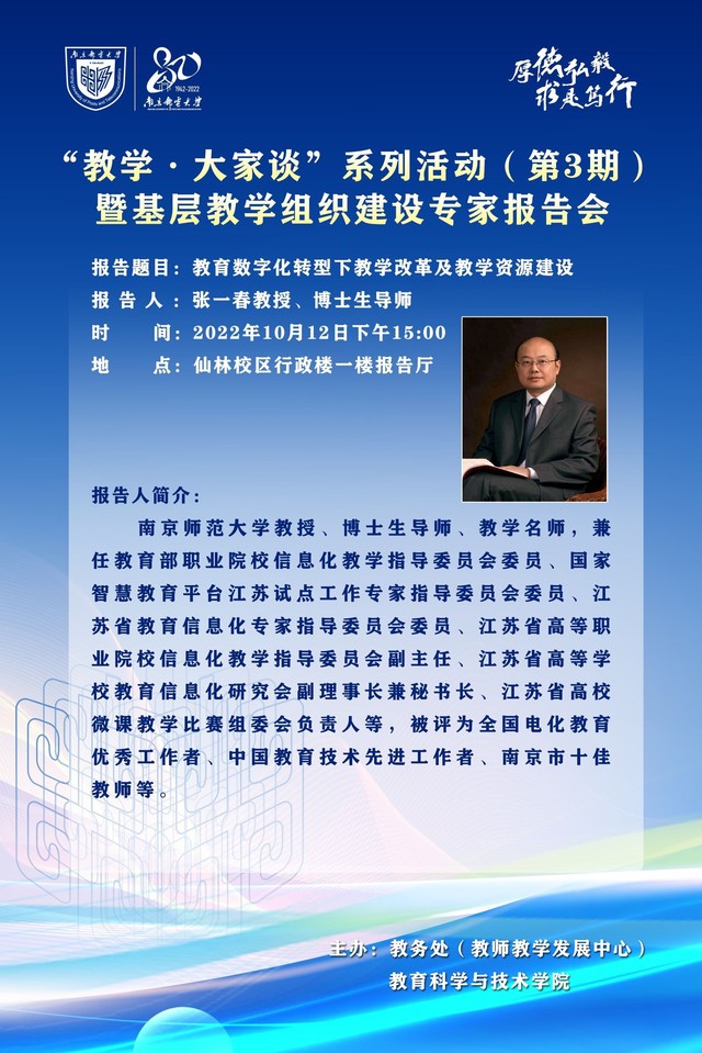 南京师范大学教学名师、博士生导师张一春教授应邀前来指导交流,并分享了题为“教育数字化转型下教学改革及教学资源建设”的学术报告。张教授结合自己的研究和实践体会,首先梳理了国家教育信息化战略转型的脉络与历史,接着进行了教育数字化转型背景下学习观、认知观、知识观、目标观、受众观、结构观、技术观、思政观和传播观的内涵挖掘与解读,在此基础上分享了新时代数字化教育资源建设的创新路径。最后张教授和现场师生进行了互动交流,对师生所提出的问题做出解答,报告会在热烈的掌声中落下了帷幕。