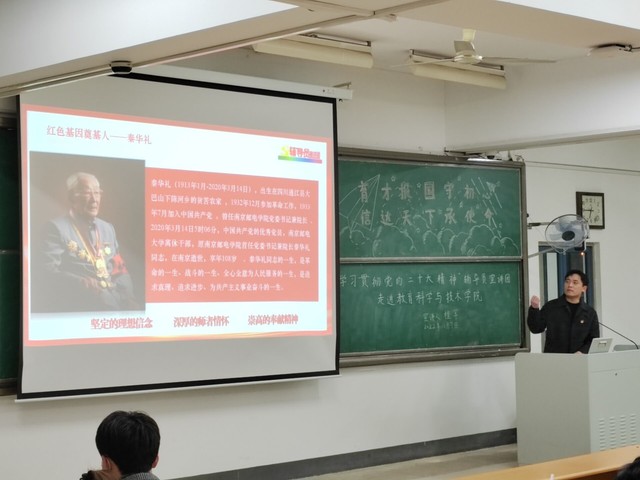 本次宣讲共分三个篇章——“弘扬建党精神、赓续红色血脉”“坚定自信自强、不忘守正创新”“聚力踔厉奋发、全面勇毅前行”。第一部分,辅导员檀军首先从党的二十大主题开讲,分析了两个确立、十年来的三件大事和伟大建党精神,接着介绍了以秦华礼老先生为代表的战邮英雄们,传达出“人在文件在,人和文件共存亡”的战邮精神。第二部分檀军老师从“实施科教兴国战略,强化现代化建设人才支撑”“推进文化自信自强,铸就社会主义文化新辉煌”“科技自立自强,人才驱动创新”三方面结合党的二十大报告、南邮教学成果与优秀科技人才范例阐释建设新时代社会主义强国的战略支撑。最后檀军老师提到南邮建设征程“因邮电而生,随通信而长,由信息而强”,南邮未来奋斗发展目标将“永续辉煌”,南邮将承国脉,薪火相传,创未来,凯歌前行!