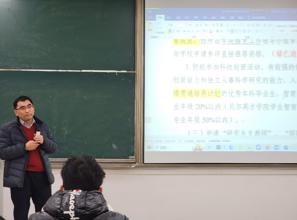 张院长向同学们介绍了我校有关推荐优秀应届本科毕业生免试攻读硕士学位研究生的相关政策,并就考研、海外留学、转专业等政策进行了详细解读。他鼓励同学们努力学习提升自己的能力,积极参加各类竞赛以及海外访学活动,充实自己的大学生活以及学业生涯。