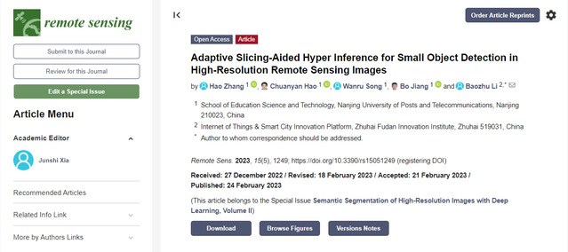 近日,我院数字媒体技术系郝川艳等老师指导2020级本科生张昊在国际期刊Remote Sensing(SCI二区,WOS一区,影响因子5.349)上发表学术论文 “Adaptive Slicing-Aided Hyper Inference for Small Object Detection in High-Resolution Remote Sensing Images”。