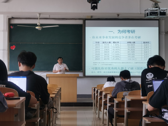 张院长首先用多组考研录取比例数据和历年本科生就业数据,客观阐述了当前严峻的就业和考研形势,帮助学生更加深入了解考研,坚定考研信心,明确考研方向。他强调,研究生学历已然是高校、科研机构、部分政府、国企单位招聘的必要条件,攻读研究生也是自我能力提升的重要途径之一,鼓励同学们能够继续在学习的道路上踏浪前行。在考研选择方面,张院长分别介绍了教育技术学和数字媒体技术专业相关的考研院校与专业,供大家参考,并给予2020级考研学子们针对性的意见。此外,张院长还向同学们分享了考研复习的全程规划、建议以及注意事项。最后,张院长还向同学们介绍了另一条读研升学通道——境外留学,他向同学们讲解了各地区留学政策、学校资源和留学费用,鼓励同学们根据自身兴趣、大学成绩、语言能力、经济基础等条件去尝试境外留学。