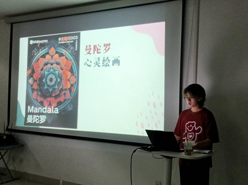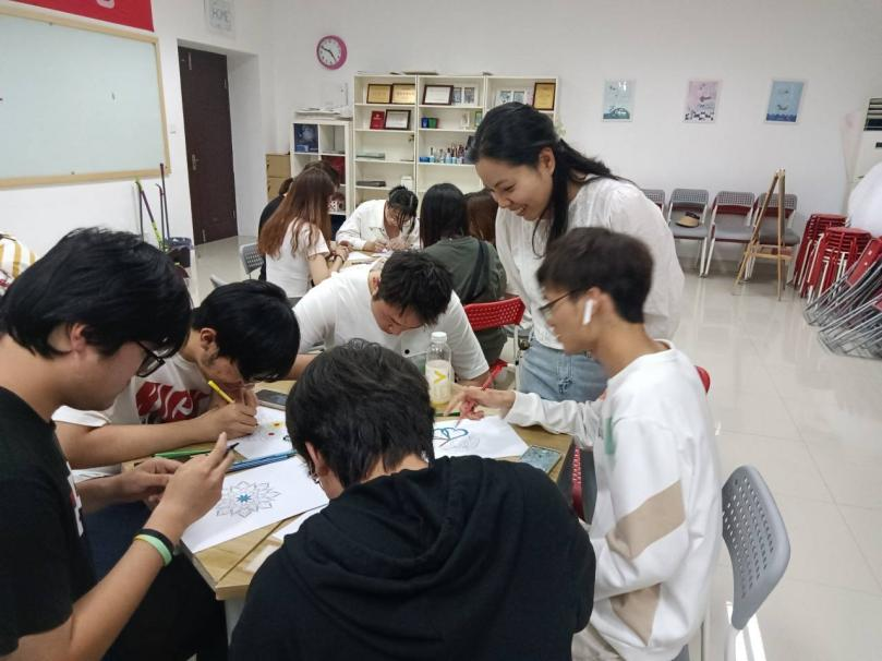 随后,大家一起观看了《色彩即故事》短片,欣赏了不同色彩在影视片段中的应用,主持人为大家讲解影片中的色彩运用如何通过色彩心理学影响观众观感。接着,朱溪筠同学为大家讲解曼陀罗心灵绘画和相关心理学知识,同学们自行挑选喜欢的曼陀罗线稿和颜色,根据心中所想进行填色和创作。