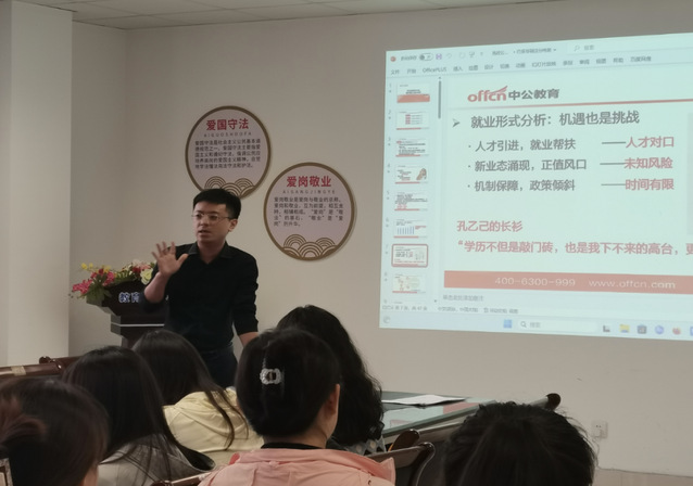 讲座接近尾声时,主讲老师为同学们做了详细的讲座总结,强调了在就业过程中多方向准备、多渠道选择、多角度把握,选择“一线多途”的就业备考模式,找准定位积极备考,通过不懈努力实现人生理想。