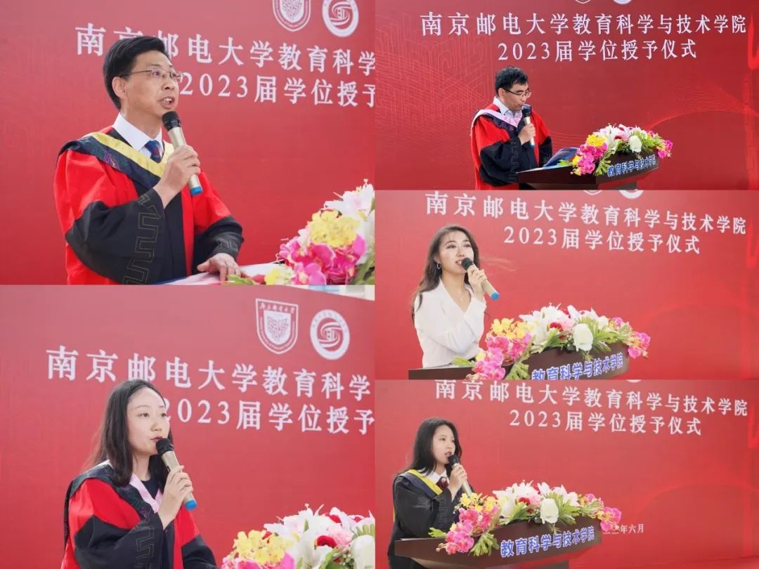 院长刘峰致辞,祝贺毕业生们毕业快乐,他鼓励毕业生们要始终怀有一颗感恩之心,大爱于心大美于行,以大爱之心为人,以大美之行处事;要不断厚植家国情怀,勇于责任担当,坚定理想信念,树立远大志向;要坚定养成终生学习的习惯,适应时代发展,不断增长才干。保持教科人的精气神,继承和发扬南邮精神,也欢迎同学们常回家看看,南邮教科院的大门永远为大家敞开!