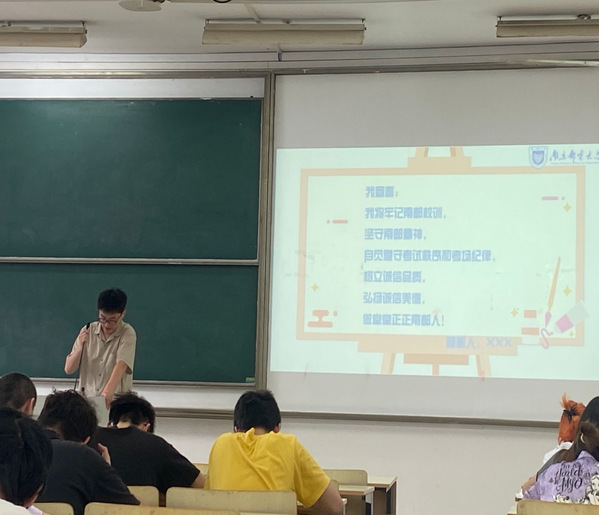 最后,由各班级学习委员组织全体参会同学签署诚信考试承诺书,年级负责人谢雨霏同学带领教育科学与技术学院2020级全体参会学生举行宣誓仪式,同学们郑重承诺将牢记南邮校训,坚守南邮精神,做到诚实守信,不抄袭、不作弊、不传递答案,维护学术的公正和公平,自觉遵守考试秩序和考场纪律,通过诚实努力获得属于自己的荣誉。