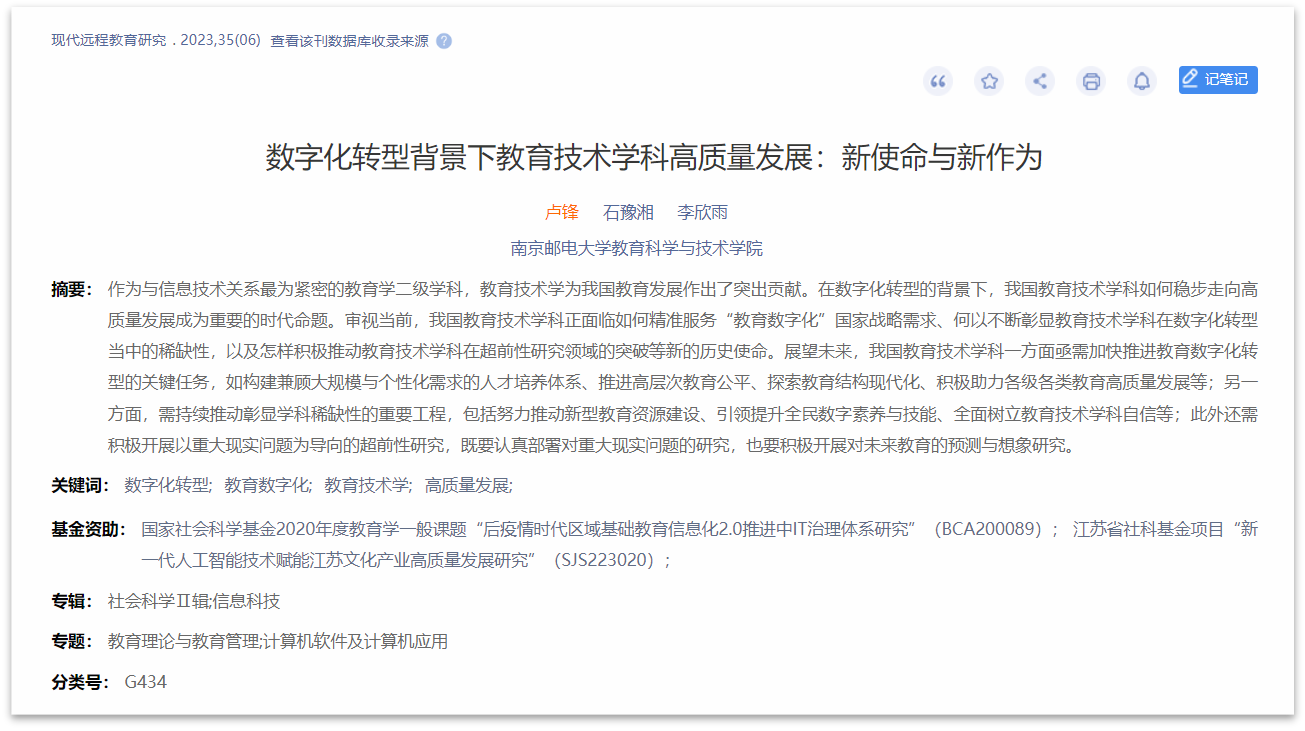 近日,我院卢锋教授在教育学CSSCI期刊《现代远程教育研究》上发表题为《数字化转型背景下教育技术学科高质量发展:新使命与新作为》的论文。