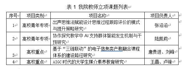 近日,江苏省教育科学规划领导小组办公室公示了2023年度教育科学规划课题评审结果。我院刘峰教授、卢锋教授与其他教师联合申报的《AIGC时代的大学生媒介素养教育研究》、《基于“三链联动”的电子信息类产教融合课程体系的建设路径研究》获得高校重点课题立项,张沿沿、陆凯莉老师独立申报的《出声思维法赋能设计思维过程跟踪评价的模式与提升策略研究》、《协作探究教学中AI支持群体智能发生机制与干预研究》获得高校青年专项课题立项。