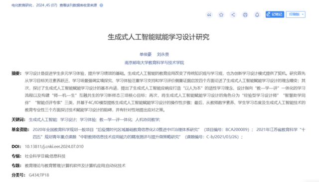 近日,我院教师单俊豪在教育学CSSCI来源期刊《电化教育研究》上发表题为《生成式人工智能赋能学习设计研究》的论文。我院刘永贵副教授为论文第二作者。
