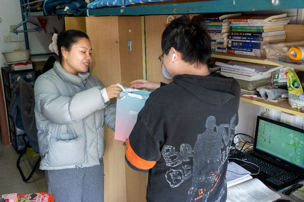 活动现场,院党委副书记、副院长张力、院分团委书记张超老师、毕业班辅导员吴美萱老师、辅导员侯士明老师一同前往柳苑、青教学生公寓,亲手为考研的同学分发糕点、咖啡、暖宝宝和文具等,代表学院向每一位考研学子表达了鼓励和期望,并与同学们进行了亲切的交谈,预祝同学们考研成功。句句真切、关心的话语,令同学们深深感受到来自学院的关爱与温暖。