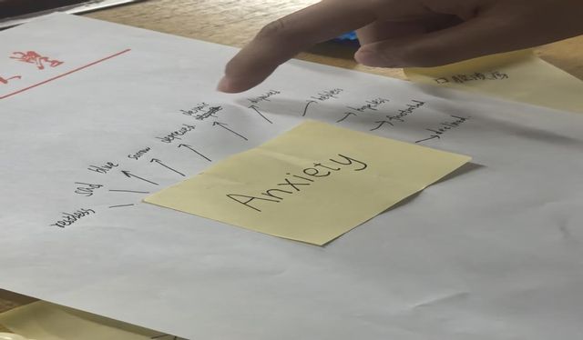 随后的“心灵共鸣”环节匠心独运。奥斯卡获奖短片《柏树阴影下》的放映让现场沉浸于艺术与哲思之中。影片结束后,参与者需选取一个意象,用英文写下感悟并进行组内分享。“孤独的树影让我想起自我成长”“飘落的叶片象征放下执念”……同学们从不同视角解读作品,中英文交织的讨论既深化了心理认知,也锻炼了跨文化表达能力。