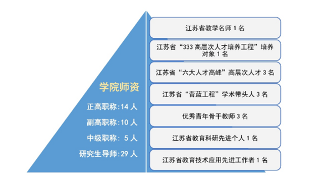 多名教师入选各类人才工程或获得各类荣誉称号,其中有江苏省教学名师1人,江苏省“333高层次人才培养工程”培养对象1名,江苏省“六大人才高峰”高层次人才3名,江苏省“青蓝工程”学术带头人3名、优秀青年骨干教师3名,江苏省教育科研先进个人1名,江苏省教育技术应用先进工作者1名。