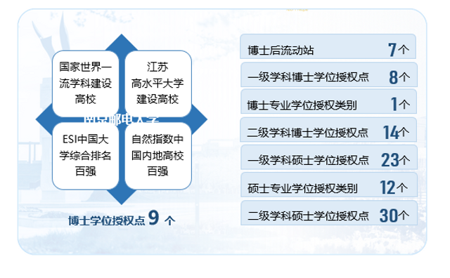 学校坐落于历史文化名城南京,现有仙林、三牌楼、锁金村、江宁四个校区,25个教学机构,在浦口区设有办学点,另外还在扬州举办了独立学院——南京邮电大学通达学院。学校现有博士后流动站7个,一级学科博士学位授权点8个,博士专业学位授权点(类别)1个。一级学科硕士学位授权点23个,硕士专业学位授权点(类别)12个,本科专业61个。目前有4个学科进入ESI学科排名全球前3‰,国家一流专业27个,国家特色专业建设点7个,国家专业综合改革试点项目1个,14个专业通过国家工程教育专业认证,国家级卓越计划专业8个。作为主要协同单位入选国家“2011协同创新中心”2个,作为牵头单位入选省“2011计划”协同创新中心2个。现有各类在籍生3万余人。