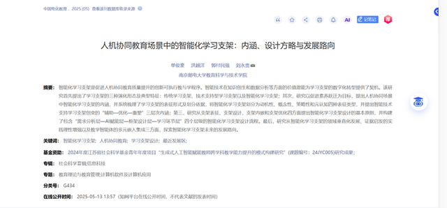 近日,我院教师单俊豪在教育学CSSCI来源期刊《中国电化教育》上发表题为《人机协同教育场景中的智能化学习支架:内涵、设计方略与发展路向》的论文。我院刘永贵副教授为论文通讯作者,本科生洪越洋为论文第二作者、本科生郭付民强为论文第三作者。